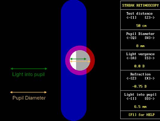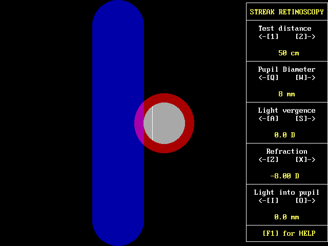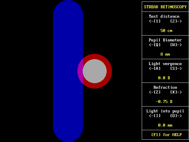 我們依據幾何光學,在個人電腦上寫了一個網膜鏡檢影法的動態模擬程式,可變動的參數有(1)測試距離、(2)瞳孔直徑、(3)光源發散度(vergence)和(4)病人的屈光度。