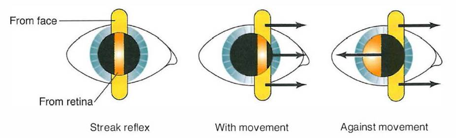 帶狀光源由瞳孔左緣移入,瞳孔是右緣先亮,反光逆向地向左移動;