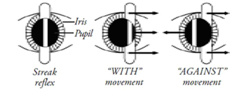 AAO BCSC Clinical Optics一書裡的網膜鏡檢影法,之前瞳孔的逆動反光也是描繪成”帶狀”的反光。