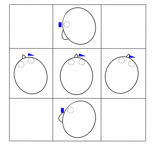 positions,見圖),有的教科書還測量右上、左上、右下和左下四個方向的斜視角度(第三眼位,tertiary