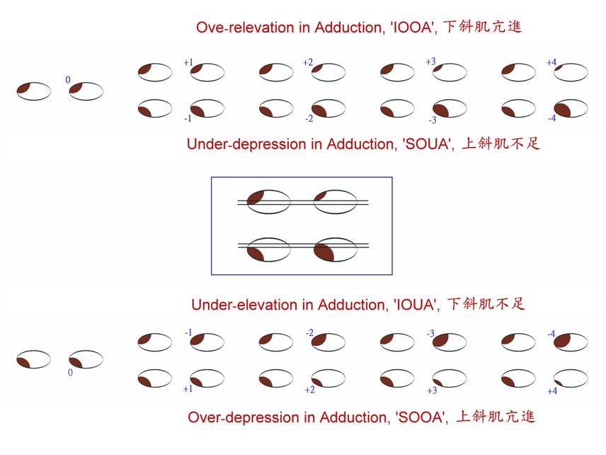 underaction,IOUA),依程度標記為-1到-4(見圖)。向內看的一眼向下看太過,稱作“上斜肌亢進”(SO