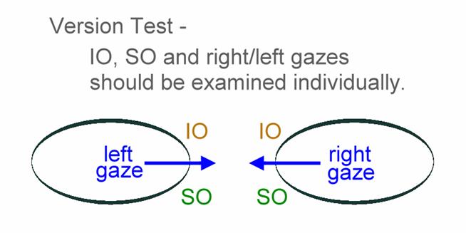 Version的檢查,叫病人看右上方,紀錄左眼的LIO;病人看左上方,紀錄右眼的RIO;病人看右下方,紀錄左眼的LSO;病人看左下方,紀錄右眼的RSO(見圖)。再有叫病人看正右方和正左方,紀錄眼球是否上吊或下移(見圖,藍色箭頭)。以上六項是各自獨立的檢查,要各自紀錄。‘RIOOA’並不意味著必然有‘RSOUA’,也不意味著向左看的時候右眼必然上吊。