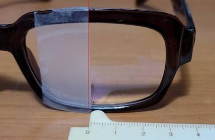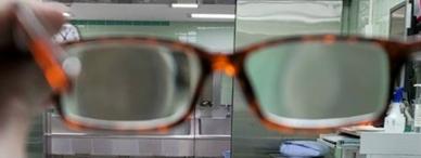 * 目前貼著“智能多焦老花鏡”藍色貼紙的商品非常浮濫,市場沒有人管理,有些只是單焦的老花眼鏡,也貼上“智能多焦”的貼紙在販賣。購買的時候要如何判別真偽?又如何判別看遠看近多焦的範圍(range)是否夠長呢?最簡單的方法是將眼鏡舉在眼前大約50公分,透過鏡片看遠方的風景(見圖)。要上下左右各方向都移動看看,看鏡片中央是不是有一個屈光率不一樣的圓形區域,好像中央是一個凸透鏡、放大鏡,而周邊的區域很明顯地屈光率比較低。