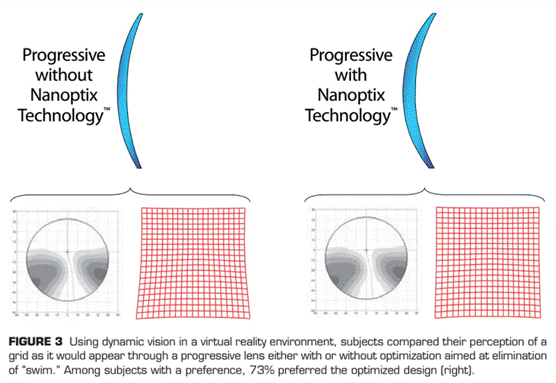 * 傳統的上遠下近的漸進多焦點老花鏡片,鏡面是一種不規則的形狀(見圖),沒有可資描述的數學公式。廠家在改良鏡片光學設計的時候,例如下圖(1)要拓寬近用區的橫向可用範圍,(2)要將兩側影像變形、不可使用的干擾區平均分佈於兩側,大都是透過觀察方格紙的方式(見圖),逐點、逐區用電腦修飾鏡面的地形圖。