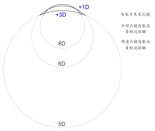 * 結論是智慧多焦(變焦)老花眼鏡的光學原理是360°多焦眼鏡:中間部份凸鏡度數高、看較近距離;周邊部分凸鏡度數低、看較遠距離。