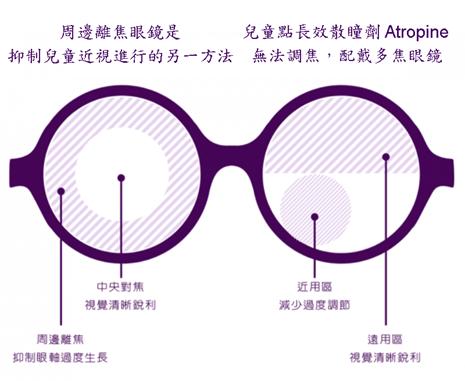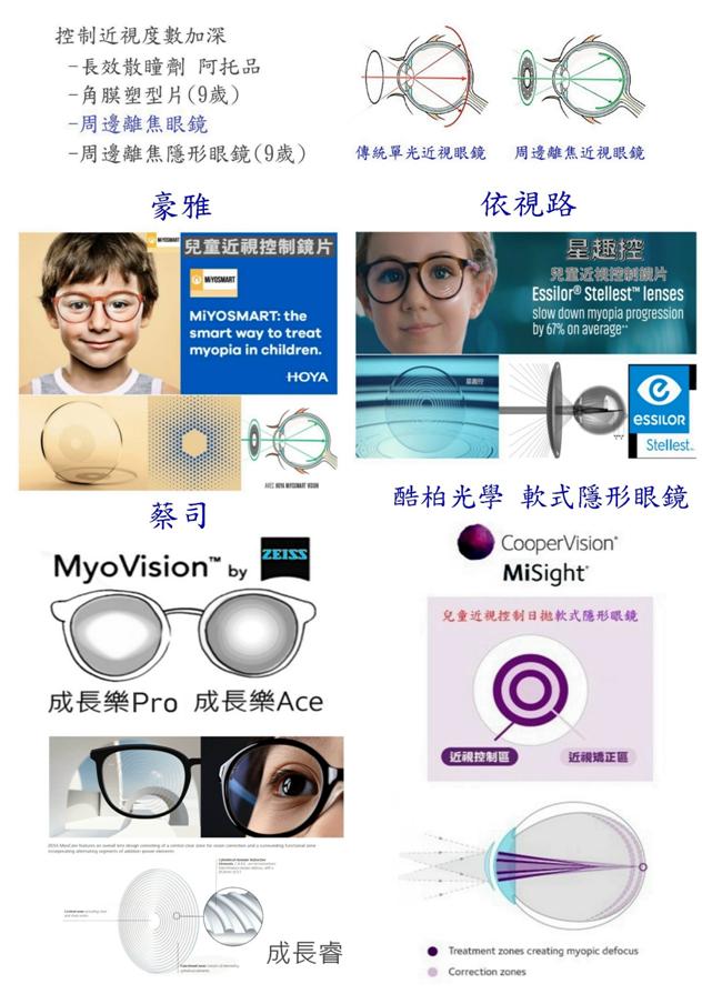 * 有HOYA的MiYOSMART,依視路的星趣控,蔡司的成長樂Pro、成長樂Ace和成長睿,和同樣也利用周邊離焦原理的隱形眼鏡CooperVision的MiSight(見圖)。