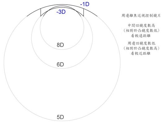 * CooperVision的MiSight軟式隱形眼鏡的光學示意圖也不錯(見圖),凹鏡度數比較淺的那幾圈成像在整個網膜之前,而不只是成像在周邊的網膜。
