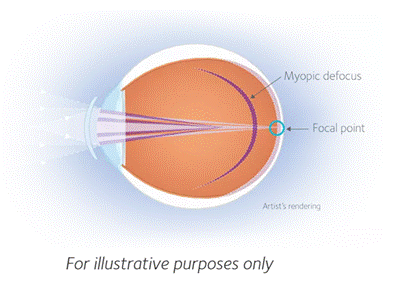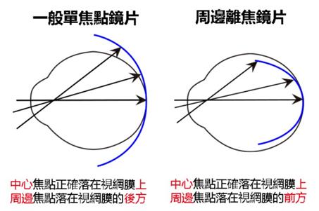* 依視路星趣控的的光學示意圖畫得比較好 – 鏡片中央部分成像在黃斑部,鏡片周邊許多凹鏡度數比較淺的小透鏡,在整個網膜之前成像,形成一個聚焦區,而不只是成像在周邊的網膜(見圖)。