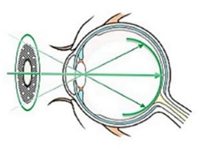 * 我認為周邊鏡片的光學並不是只成像在網膜的周邊部分,而是成像在全部的網膜。例如你把單光眼鏡的中央部分塗黑(見圖),眼鏡周邊的光學仍然和中央一樣,將完整的影像成像於網膜上 – 包含網膜的中央和周邊,並不是只成像在網膜的周邊部分。