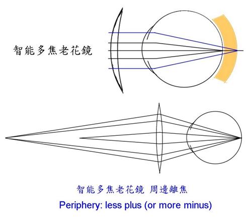 * 半世紀以來漸進多焦點老花鏡都是設計成視線要直接穿過鏡片 – 看遠處視線從鏡片上面的部分穿過;看近處視線從鏡片下面的部分穿過。由智能多焦老花眼鏡的實例看來,這個基本的假設與設計是不必要的。