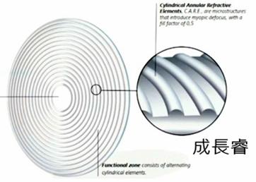 * 蔡司成長樂Ace的光學示意圖說鏡片中央的部分成像在黃斑部,鏡片周邊360°凹鏡度數比較淺的部分,在網膜的周邊成像於網膜之前(見圖)。
