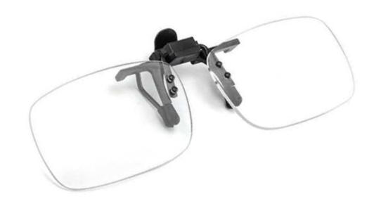 * 目前市面上賣的智慧多焦老花鏡只有一種度數 +3D~+1D,只適合正視眼、沒有度數的人使用。一般近視族如果要用,只能將這種鏡片做成前掛式夾片來使用(見圖)。