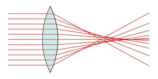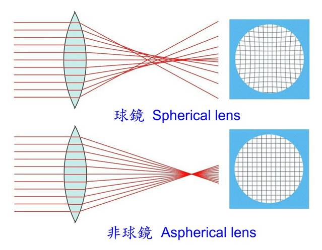 球差是指早期工藝不發達的時候,透鏡的表面製作成球形的較為簡單,稱之為球鏡(Spherical lens)。球鏡的聚焦不完美,鏡片中央部分和鏡片周邊部分聚焦的位置沒有完美地在同一點,中央聚焦力低、周邊聚焦力高,這叫做球差(Spherical