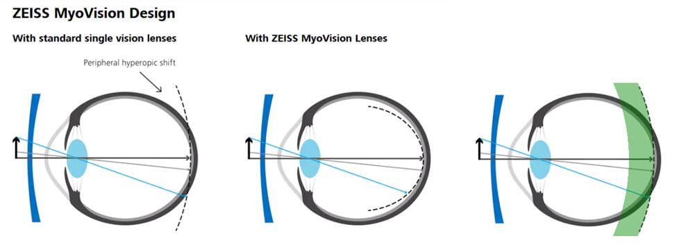 MyoVision通常是近視眼用的凹透鏡,周邊360°多焦的部分,凹鏡的度數比較低,看近用。(相比較於傳統的多焦眼鏡,只有內下的部分是度數比較低的凹鏡。)