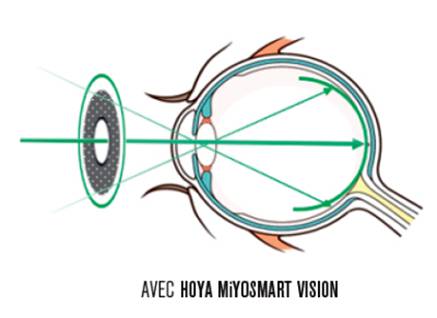 MiYosmart的構造類似,它鏡片周邊小透鏡的分布範圍更廣,並且這些小透鏡的度數不完全相同,於是在網膜之前產生一個“聚焦區”,而不是一個聚焦面(見圖)。