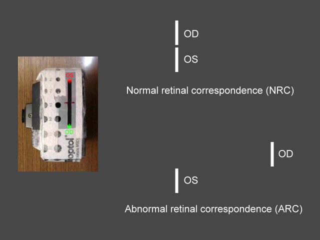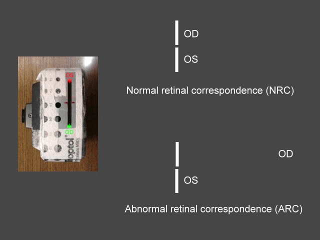 retinal correspondence,NRC)的情況下,外斜眼位時兩眼的後像依然上下對齊(上圖);不正常網膜對應(Abnormal