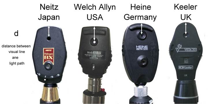 直接眼底鏡的光源幾乎和視孔在同樣位置,視孔的上緣都有一個邊。四家著名廠牌的直接眼底鏡