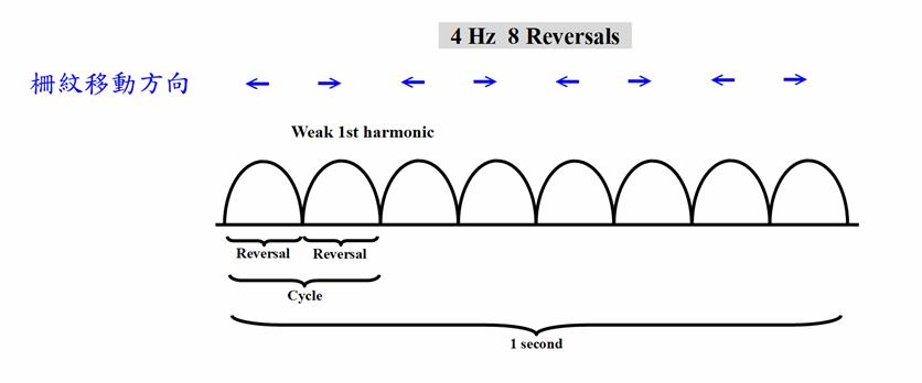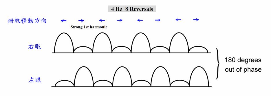 隨著正常雙眼視的發育,鼻、顳側不對稱的運動覺漸漸發育成為鼻、顳側對稱的運動覺。越細的柵紋(高空間頻率)(右邊兩圖)、左右振動越快的柵紋(高時間頻率)(下面兩圖)發育成熟,或者說穩態視誘發電位由基頻(
